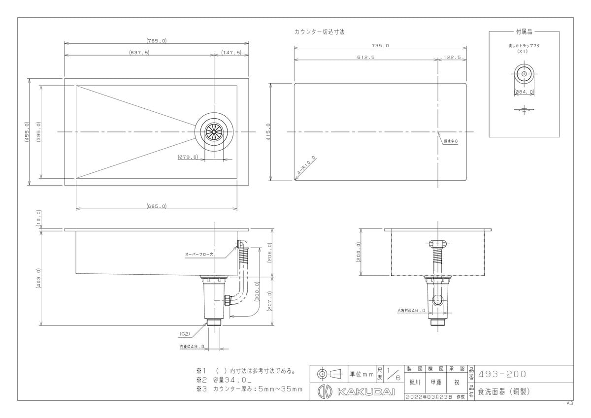 説明文:●切込寸法W735×D415ミリ