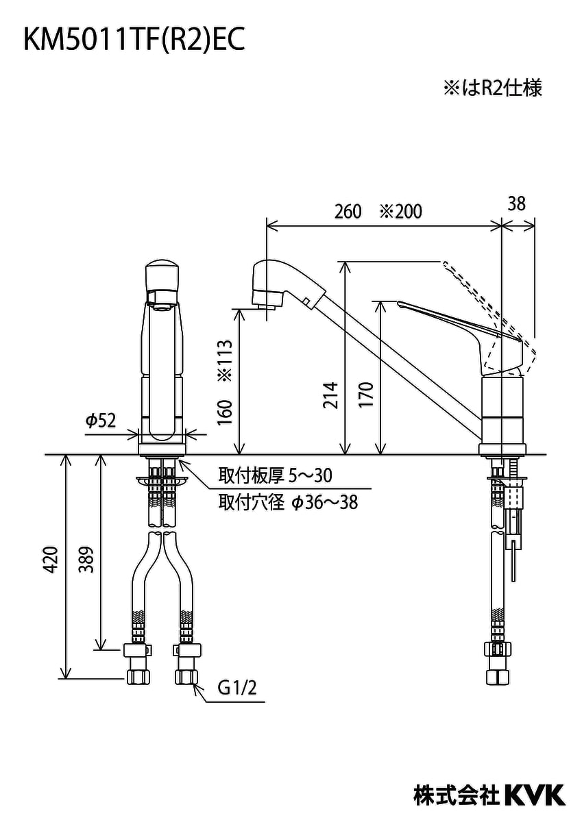 ●商品名: シングルレバー式シャワー付混合栓(eレバー)200mmパイプ付