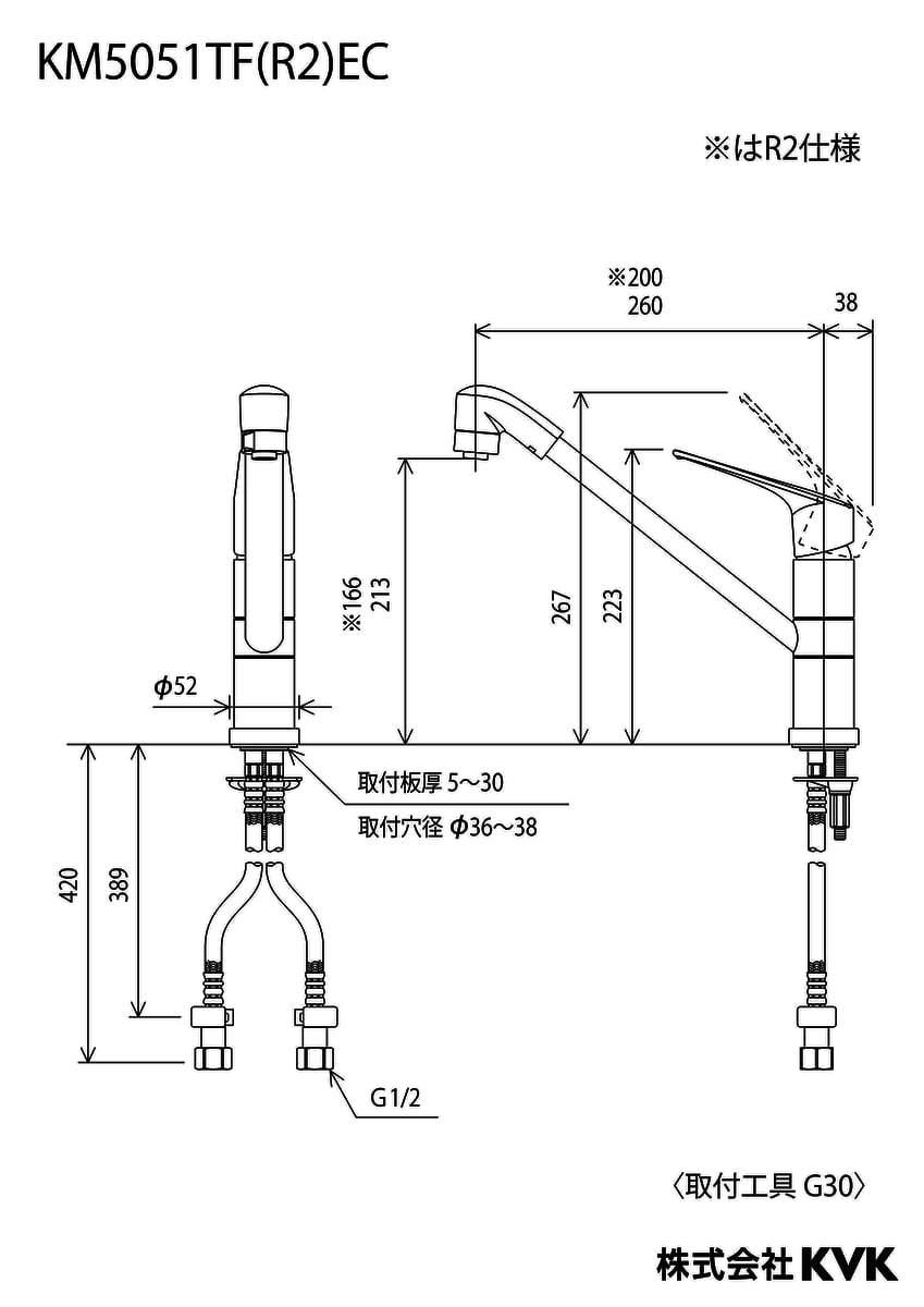 ●商品名: シングルレバー式シャワー付混合栓(eレバー)260mmパイプ付