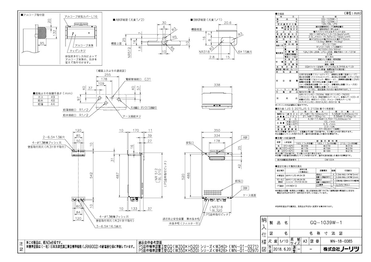 シリーズ名:GQ-1039W-1 機能バリエーション:給湯器 自動機能:- 号数:2.5~10号 設置形態:屋外壁掛/PS標準/PSアルコーブ (PSアルコーブ設置は、アルコーブ排気カバーL16が必要)排気方法:前方排気/アルコーブ排気 外形寸法:H520×W350×D170 外装:亜鉛メッキ鋼鈑粉体塗装 (耐塩害仕様)色:GQホワイト(近似色:マンセルNO.9.3YR8.4/1.0) 質量:13.5kg (満水時:14.5kg)発売年月:2018年9月 排気バリエーション:W,W-PS 給水装置認証番号:OW1004 品コード:019EENA