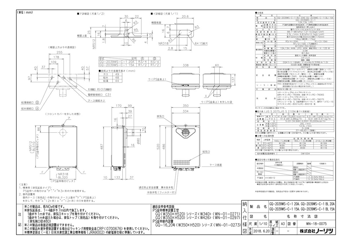 給湯専用 20号 屋外 壁掛形 PS扉内前方排気延長形