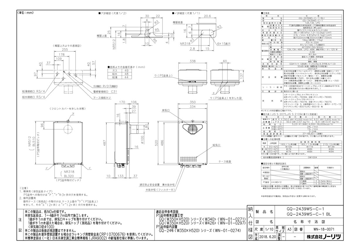 給湯専用 24号 屋外 壁掛形 PS扉内前方排気延長形