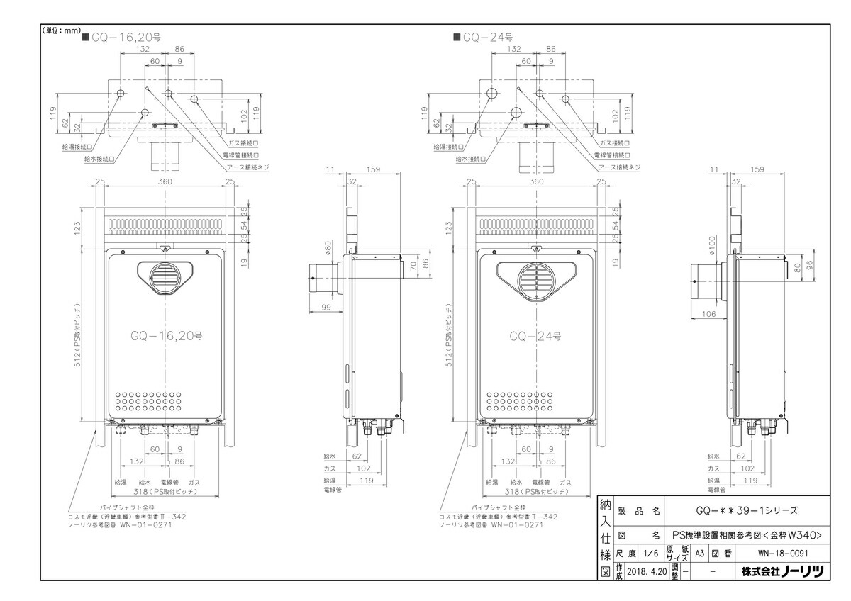 給湯専用 24号 屋外 壁掛形 PS扉内設置形