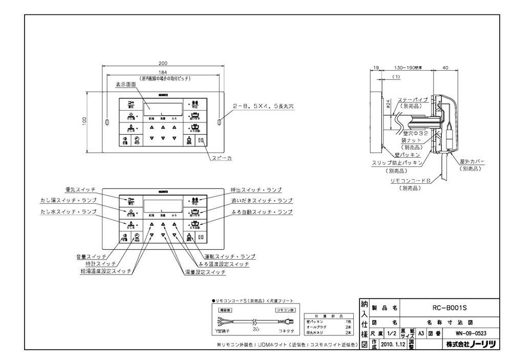 ノーリツ ユコアGTガス ふろ給湯器用 浴室リモコン シンプルタイプ