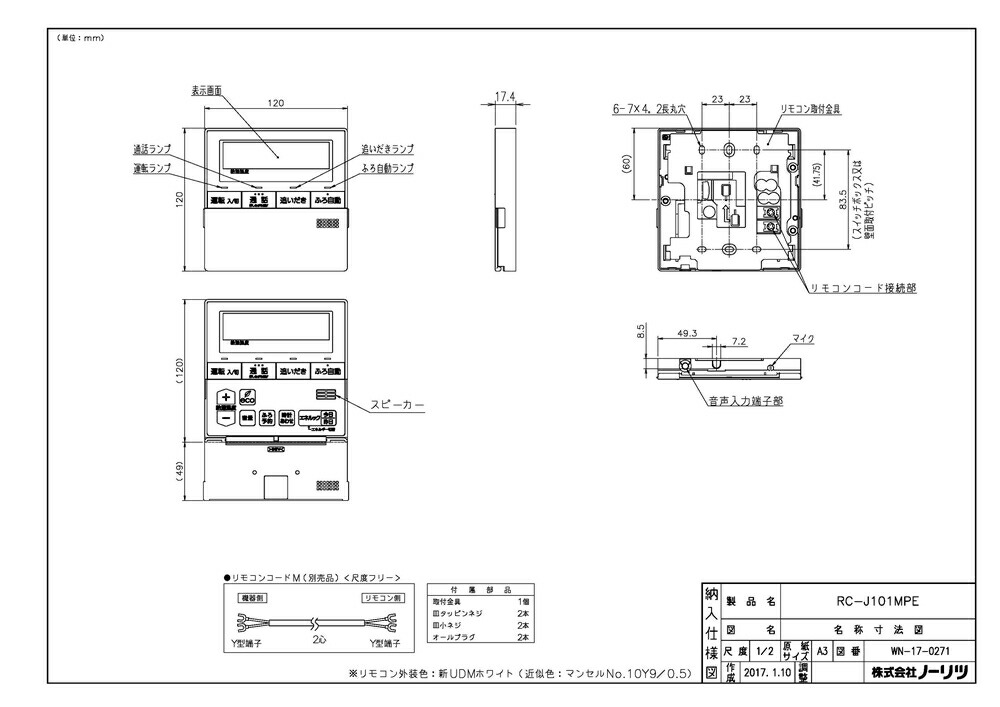 ノーリツ ユコアGTガス ふろ給湯器用 台所リモコン インターホン付きタイプRC-J101MPE