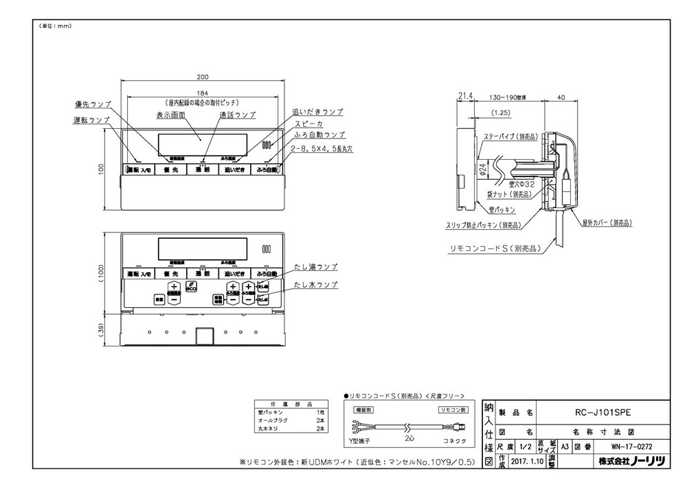 ノーリツ ユコアGTガス ふろ給湯器用 浴室リモコン インターホン付きタイプRC-J101SPE