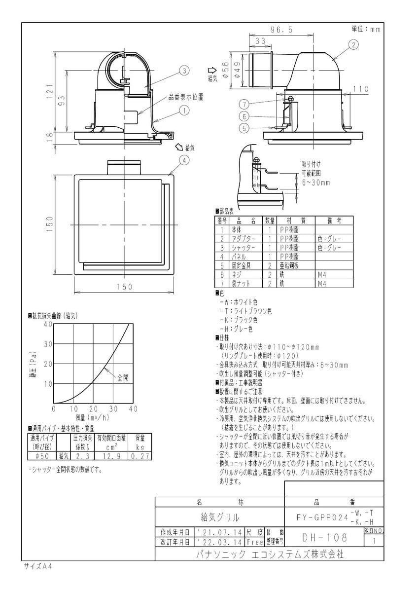 給気グリル(天井取付用)