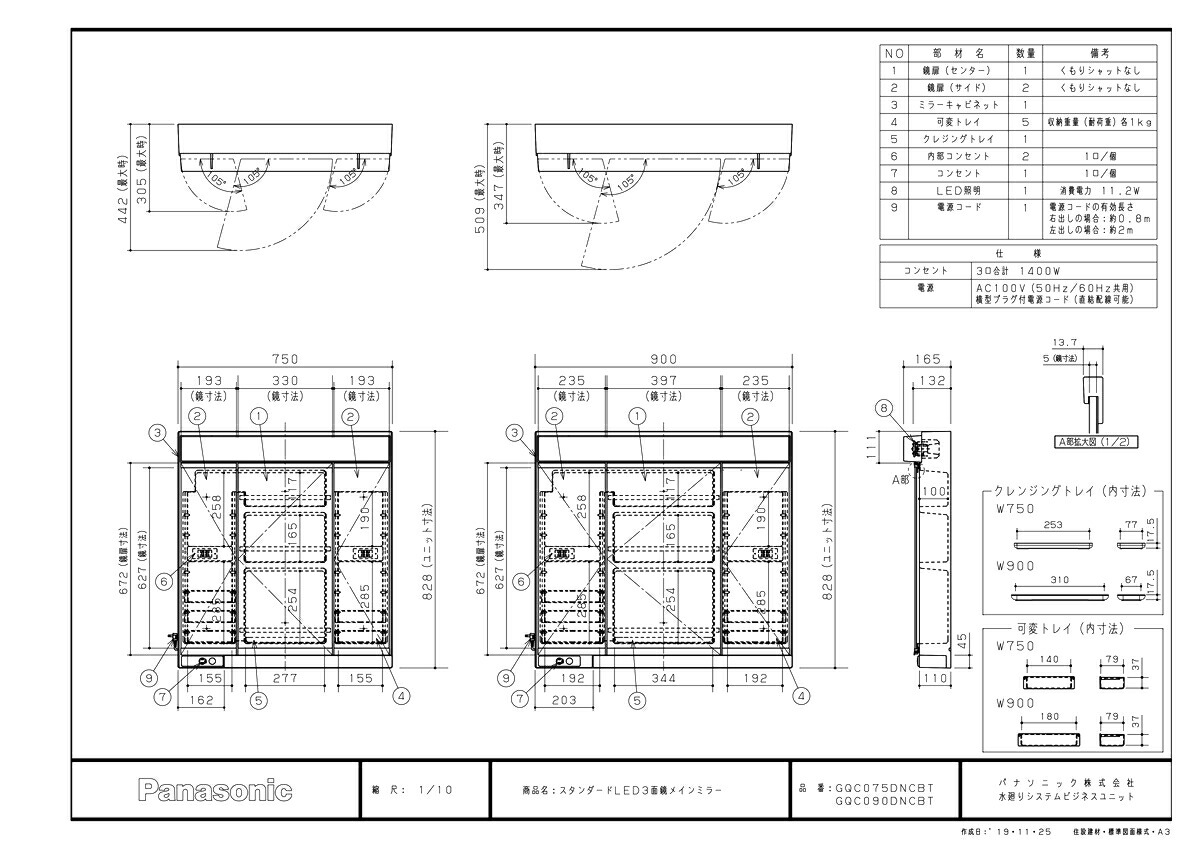 ミラーキャビネット 900mm スタンダードLED3面鏡 ミドルミラー