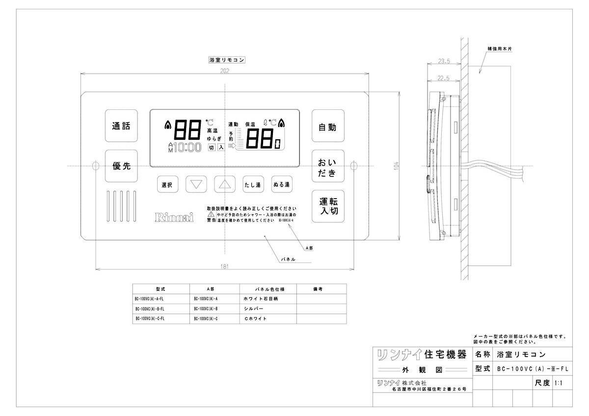 品名コード :25-9708シリーズ名 :MBC-100VC(A)商品名 :給湯風呂リモコン型式名 :BC-100VC(A)-C-FL重量(Kg) :3.77Kg梱包縦寸法 :320梱包横寸法 :360梱包幅寸法 :250体積(M3) :0.029M3販売開始日 :2007/09/21