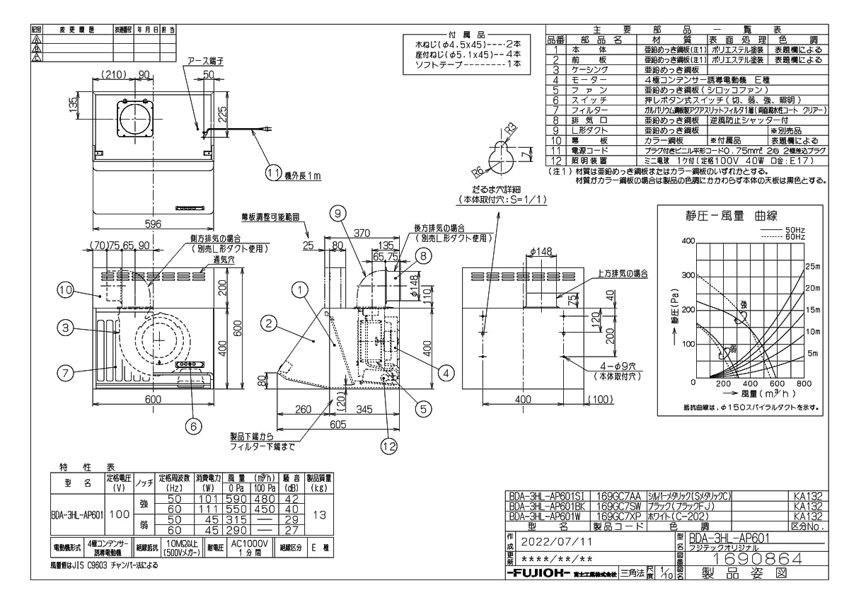 レンジフード BDA シロッコファン・ブーツ型 幅60cm 高60cm ブラック