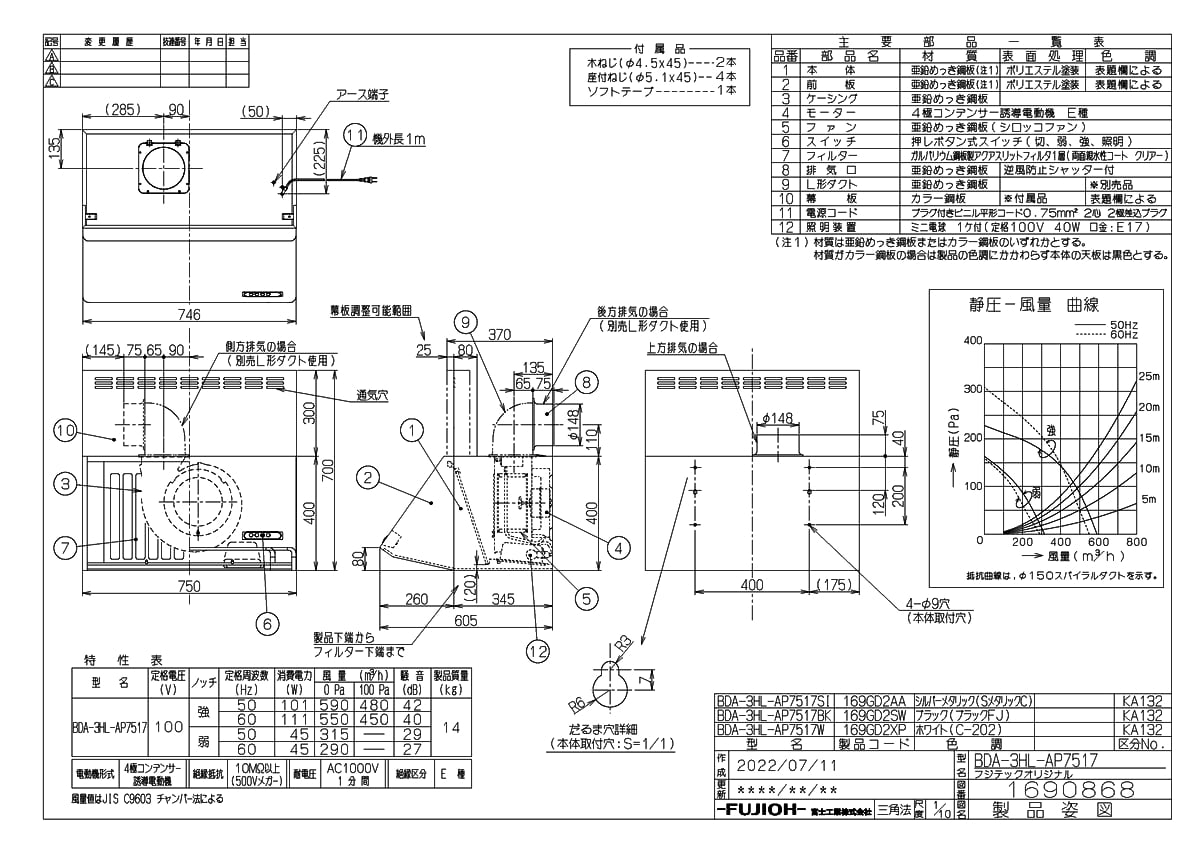 レンジフード BDA シロッコファン・ブーツ型 幅75cm 高70cm ブラック