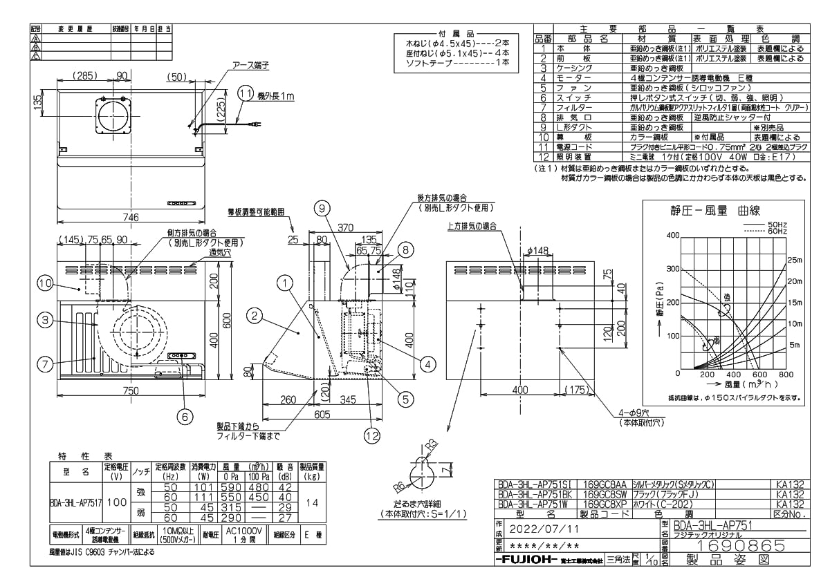 レンジフード BDA シロッコファン・ブーツ型 幅75cm 高60cm ブラック