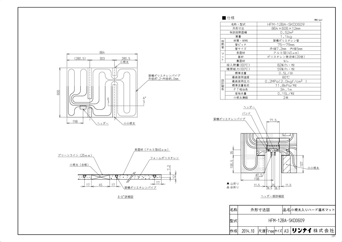 品名コード :25-7071商品名 :小根太入り温水マット型式名 :HFM-12BA-SKD0609重量(Kg) :2.6Kg梱包縦寸法 :1530梱包横寸法 :625梱包幅寸法 :35体積(M3) :0.034M3販売開始日 :2007/10/21