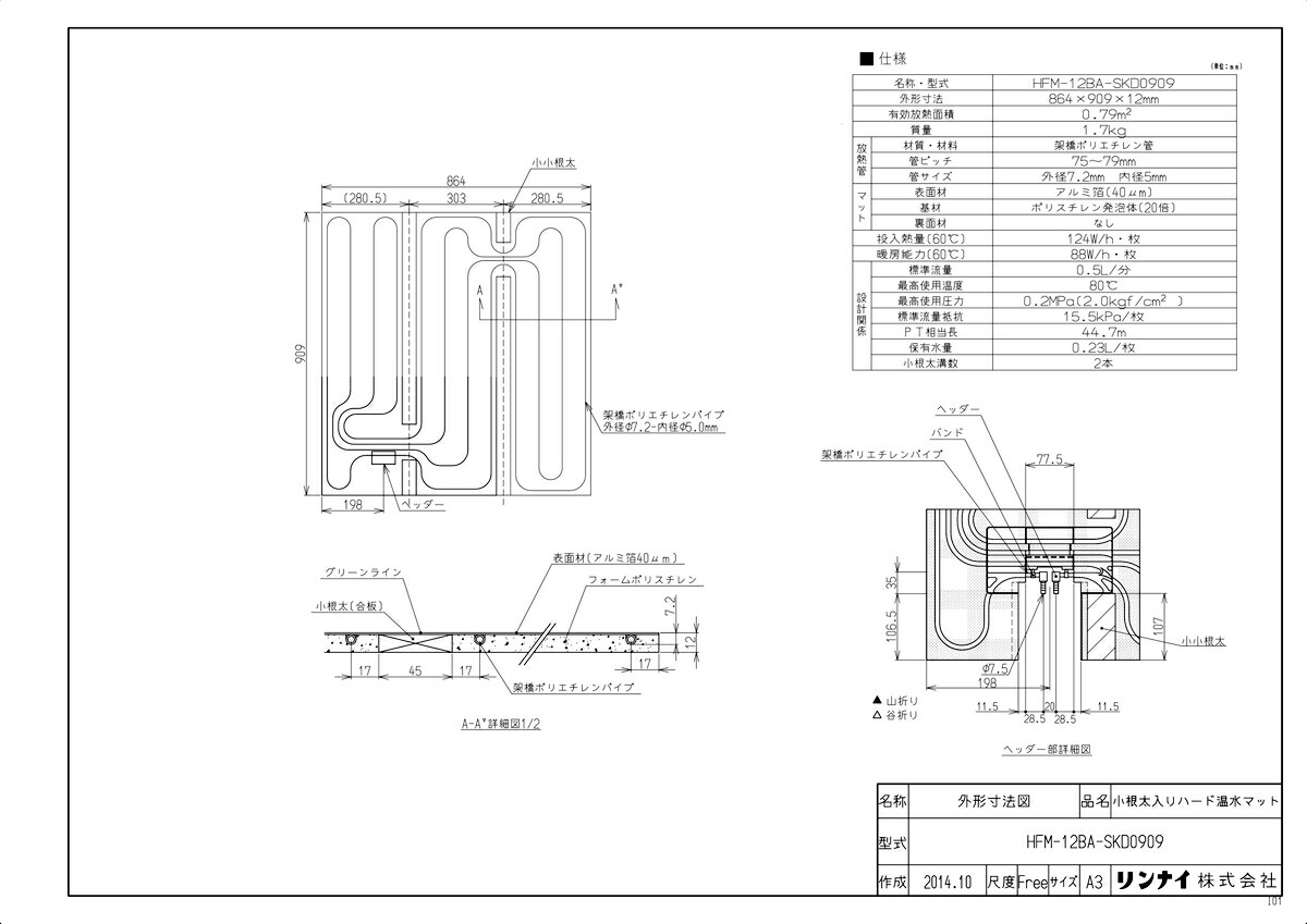 品名コード :25-7089商品名 :小根太入り温水マット型式名 :HFM-12BA-SKD0909重量(Kg) :3.6Kg梱包縦寸法 :1730梱包横寸法 :885梱包幅寸法 :35体積(M3) :0.054M3販売開始日 :2007/10/21