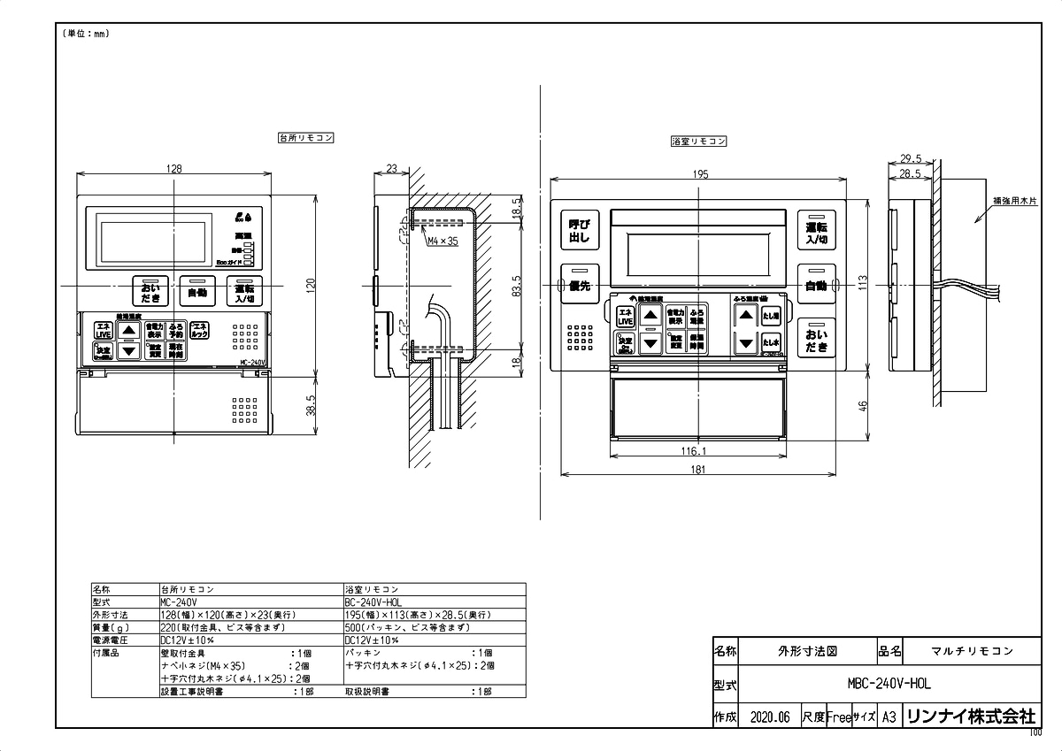 品名コード :24-6298商品名 :マルチリモコン型式名 :MBC-240V-HOL仕向先名 :リンナイ重量(Kg) :1.2Kg外形寸法_高さ :120mm外形寸法_幅 :128mm外形寸法_奥行 :23mm梱包縦寸法 :520梱包横寸法 :325梱包幅寸法 :290体積(M3) :0.049M3付属部品 :台所リモコン用【壁取付金具:1個 ナベ小ネジ(M4×35):2個 十字穴付丸木ネジ(φ4.1×25):2個】浴室リモコン用【十字穴付丸木ネジ(φ4.1×25):2個】設置工事説明書:1部 取扱説明書:1部販売開始日 :2020/10/01