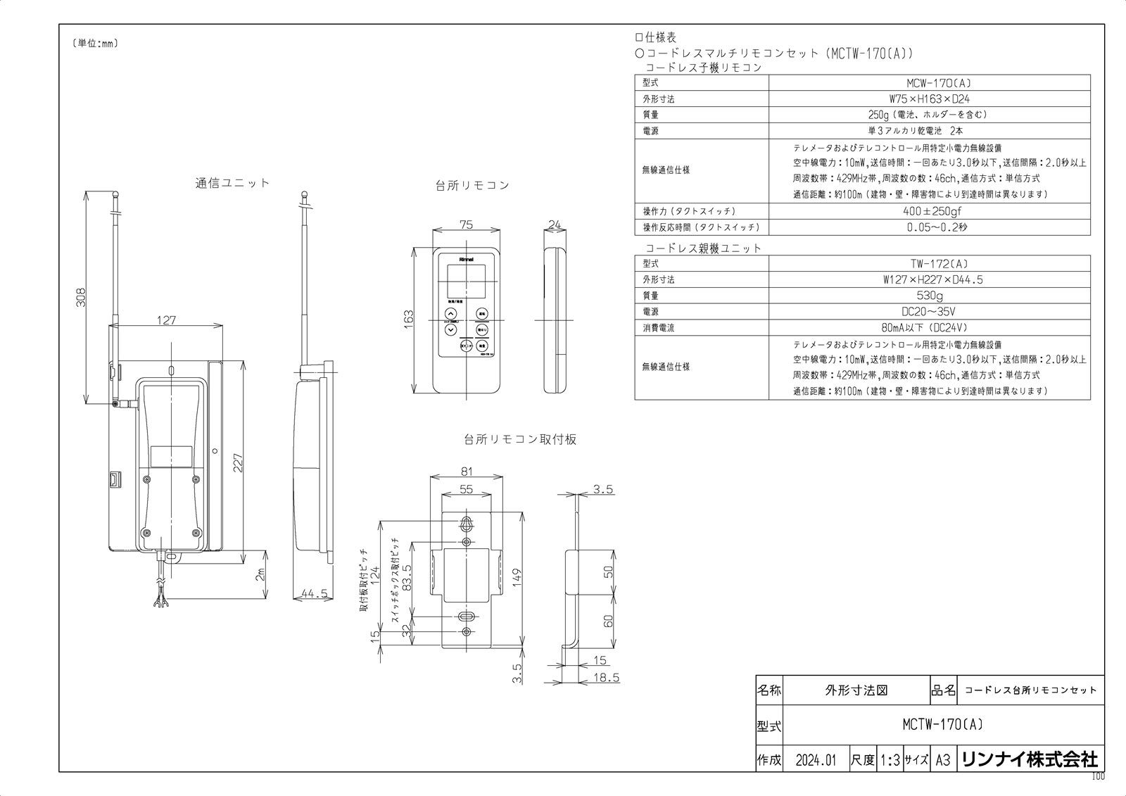 付属部品:□台所リモコン用 【取付板:1個 単3アルカリ電池:2個 PYプラグ:2個
