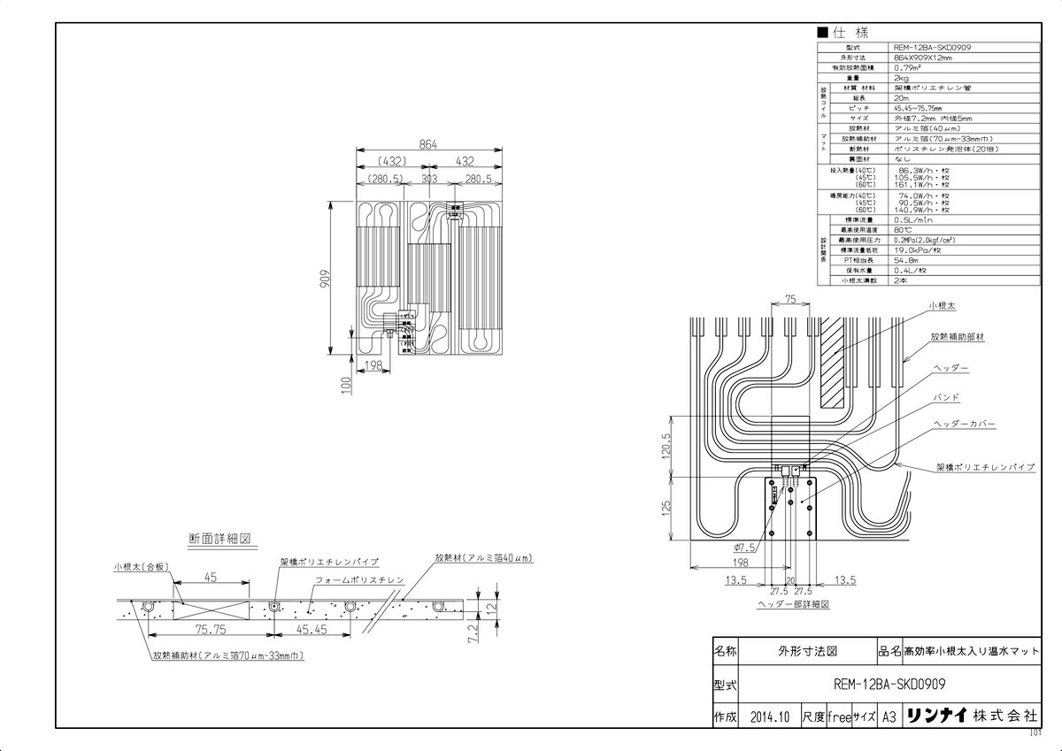 品名コード :25-2705シリーズ名 :REMシリーズ商品名 :高効率床暖房温水マット型式名 :REM-12BA-SKD0909重量(Kg) :3.9Kg梱包縦寸法 :904梱包横寸法 :946梱包幅寸法 :22体積(M3) :0.019M3販売開始日 :2007/11/01
