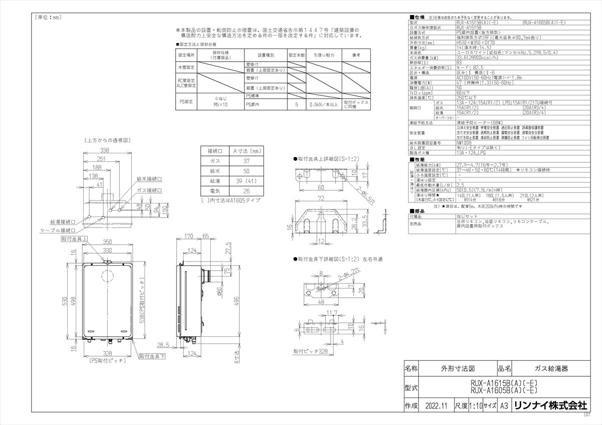 給湯専用ガス給湯器 16号 PS扉内後方排気型