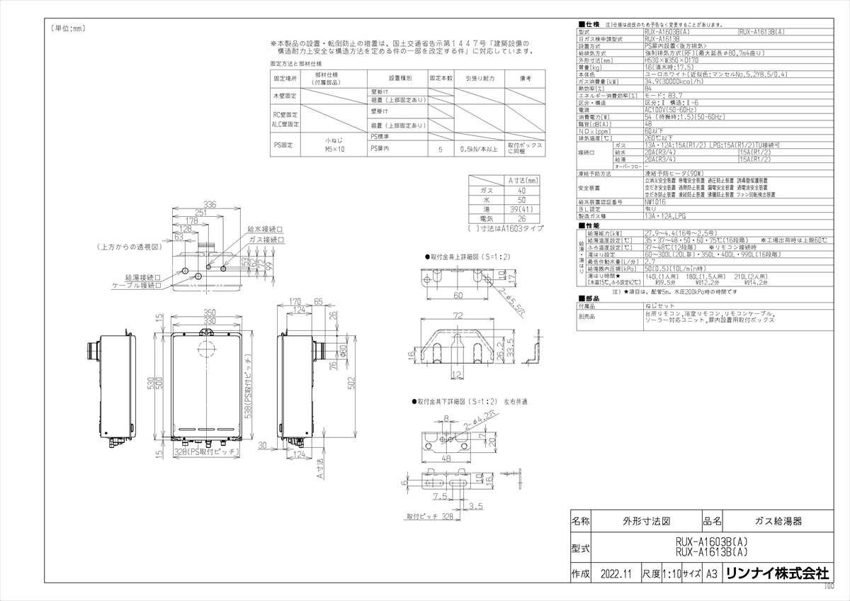 給湯専用ガス給湯器 16号 PS扉内後方排気型