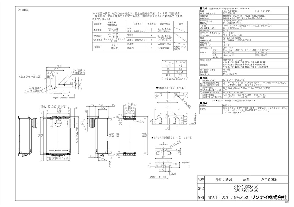 給湯専用ガス給湯器 20号 アルコーブ設置型