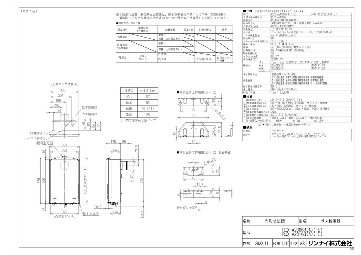 給湯専用ガス給湯器 20号 PS扉内後方排気型