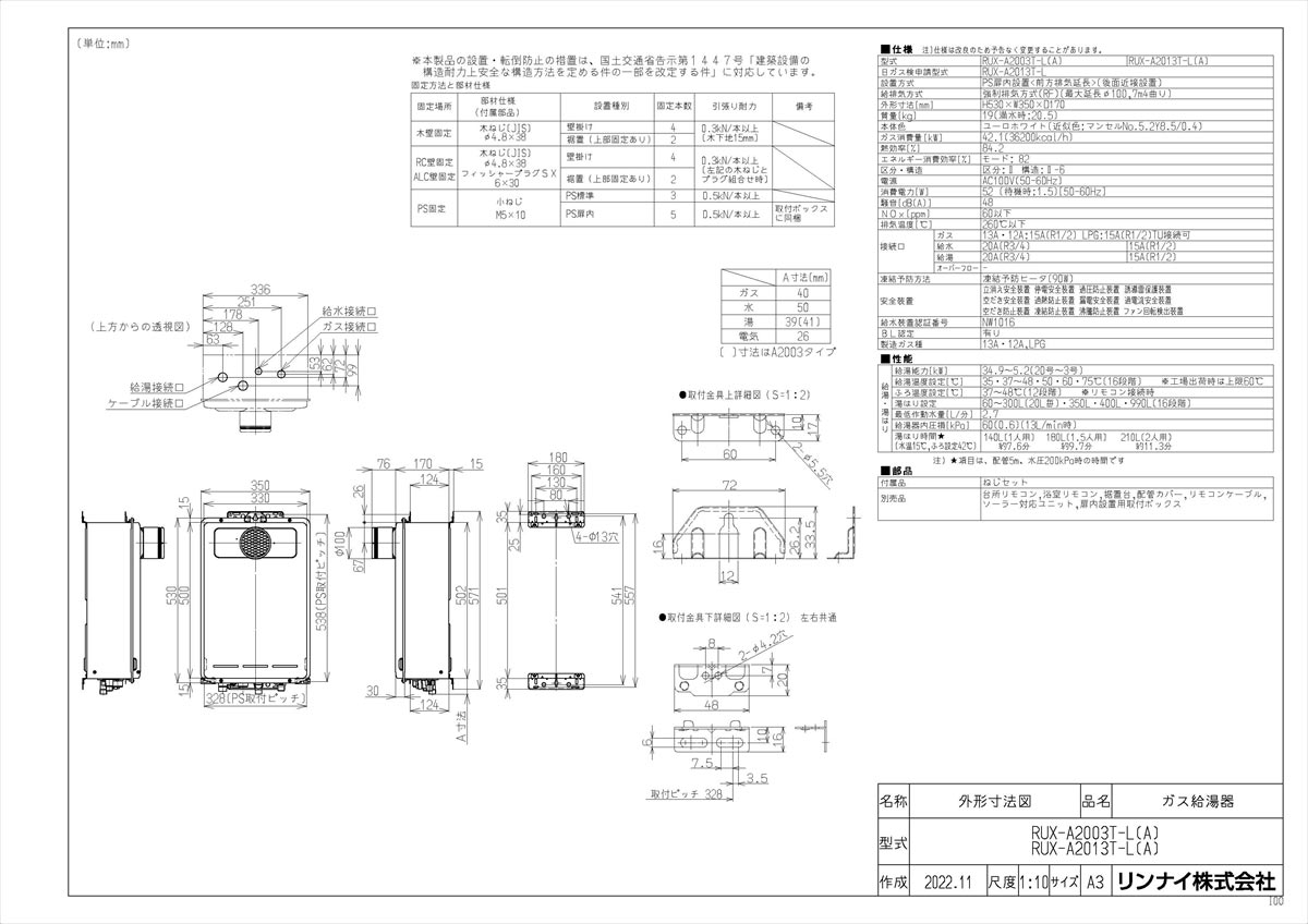 給湯専用ガス給湯器 20号 PS扉内設置型延長前排気