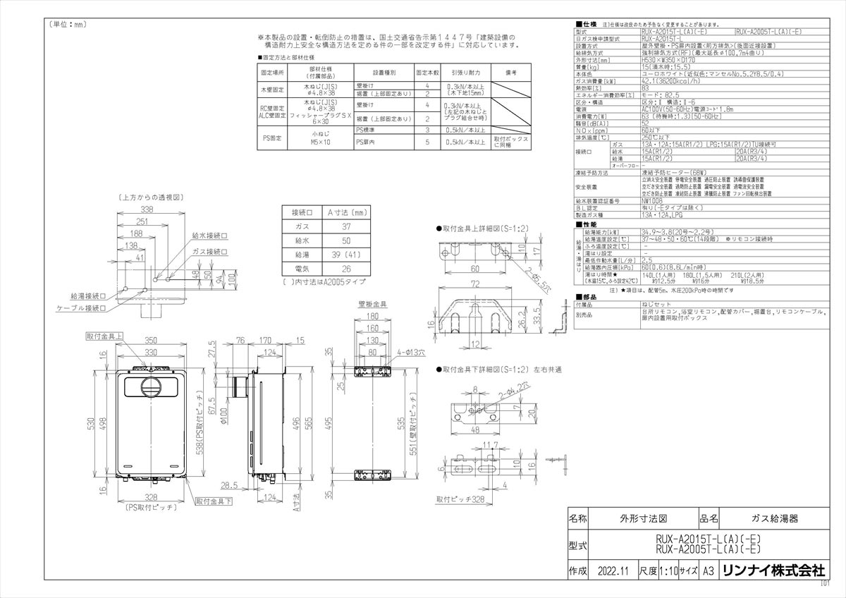 給湯専用ガス給湯器 20号 PS扉内設置型延長前排気