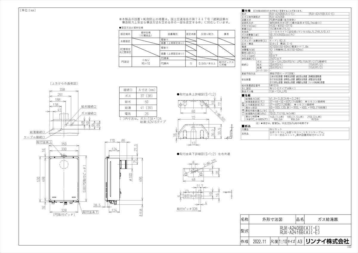 給湯専用ガス給湯器 24号 PS扉内後方排気型