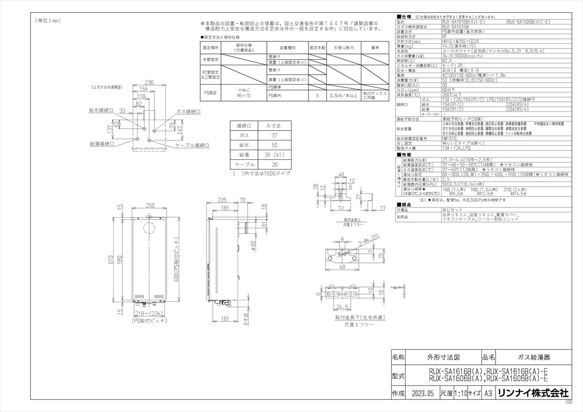 品名コード:23-1725シリーズ名:RUX-SA商品名:ガス給湯器型式名:RUX-SA1606B(A)-E仕向先名:リンナイ重量(Kg):17.5Kg外形寸法_高さ:610mm外形寸法_幅:250mm外形寸法_奥行:225mm梱包縦寸法:435梱包横寸法:355梱包幅寸法:775体積(M3):0.12M3後継型式類似型式付属部品:ねじセット販売開始日:2023/07/01