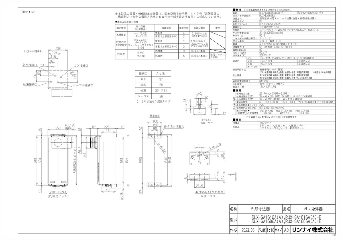 品名コード:23-1823シリーズ名:RUX-SA商品名:ガス給湯器型式名:RUX-SA1616A(A)-E仕向先名:リンナイ重量(Kg):18Kg外形寸法_高さ:610mm外形寸法_幅:250mm外形寸法_奥行:225mm梱包縦寸法:435梱包横寸法:355梱包幅寸法:775体積(M3):0.12M3後継型式類似型式付属部品:ねじセット販売開始日:2023/07/01