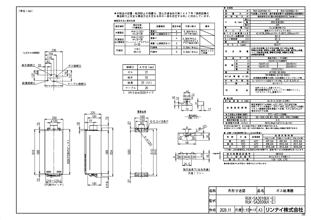 給湯専用ガス給湯器 20号 PS扉内上方排気型 従来型