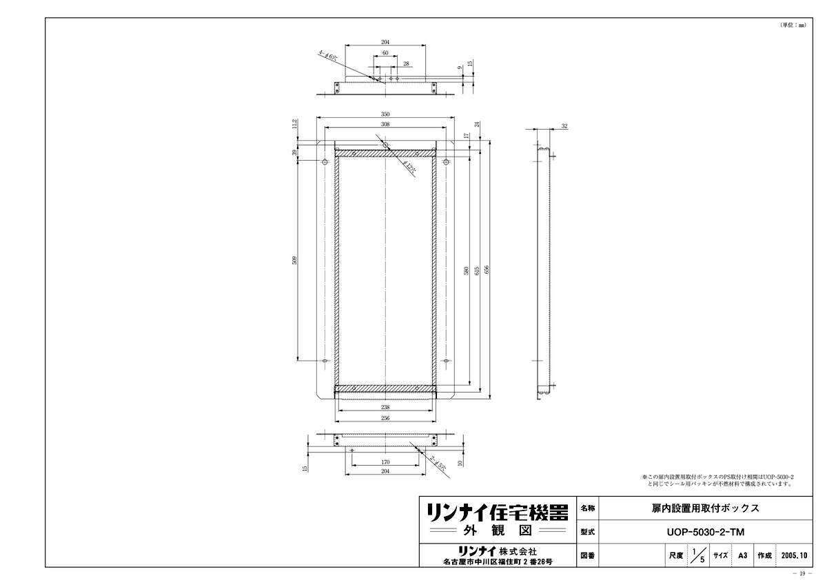 品名コード :24-5255商品名 :扉内設置用取付ボックス型式名 :UOP-5030-2-TM梱包縦寸法 :772梱包横寸法 :480梱包幅寸法 :70体積(M3) :0.026M3販売開始日 :2005/08/01