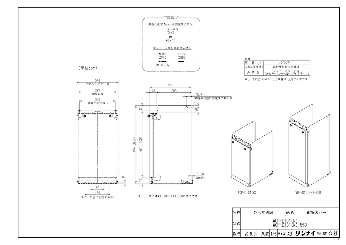 品名コード :24-8647シリーズ名 :WOP-Dシリーズ商品名 :配管カバー型式名 :WOP-D101(K)-650重量(Kg) :4Kg梱包縦寸法 :755梱包横寸法 :525梱包幅寸法 :120体積(M3) :0.048M3販売開始日 :2018/10/01