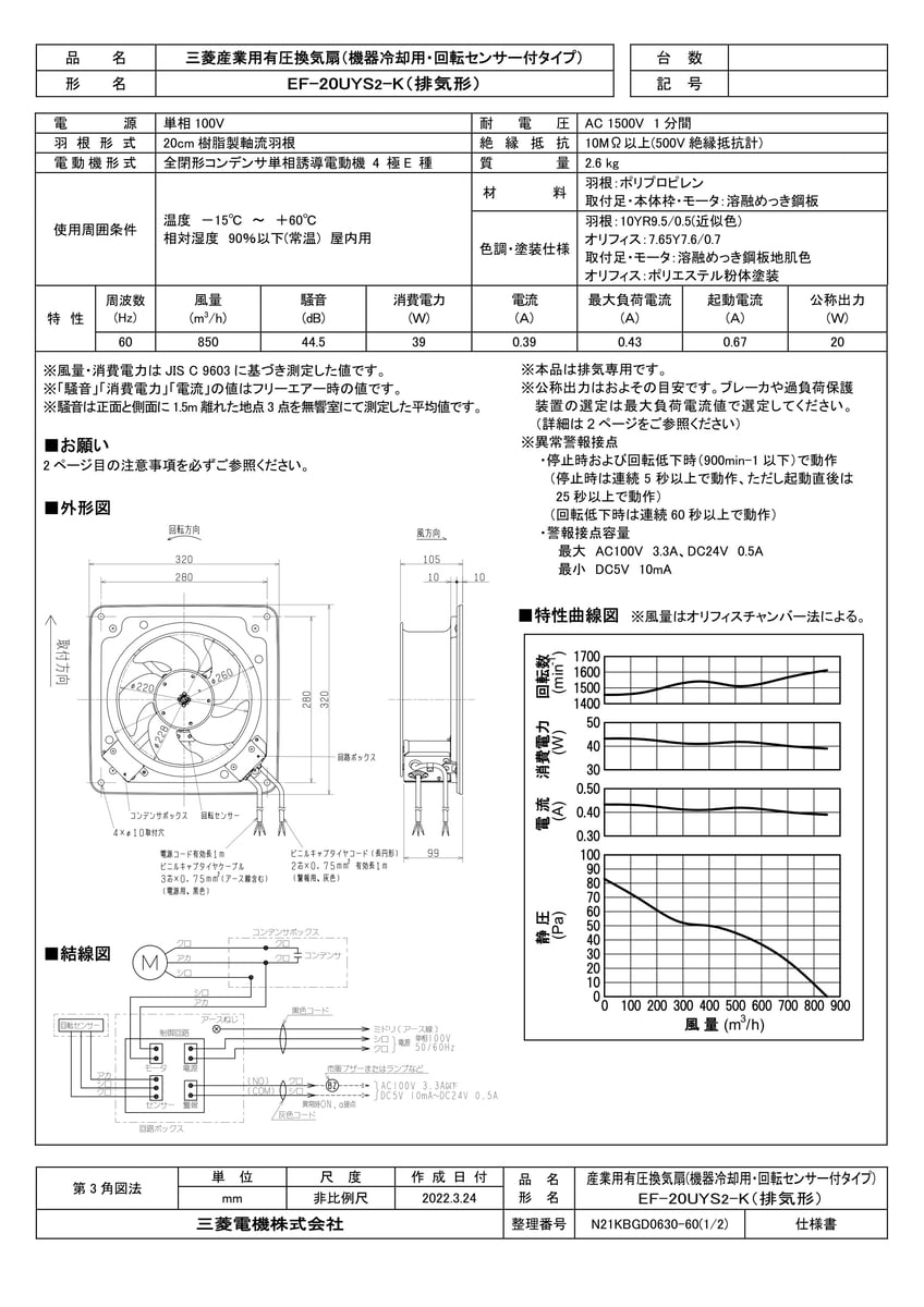 有圧換気扇 機器冷却用排気形 回転センサー付