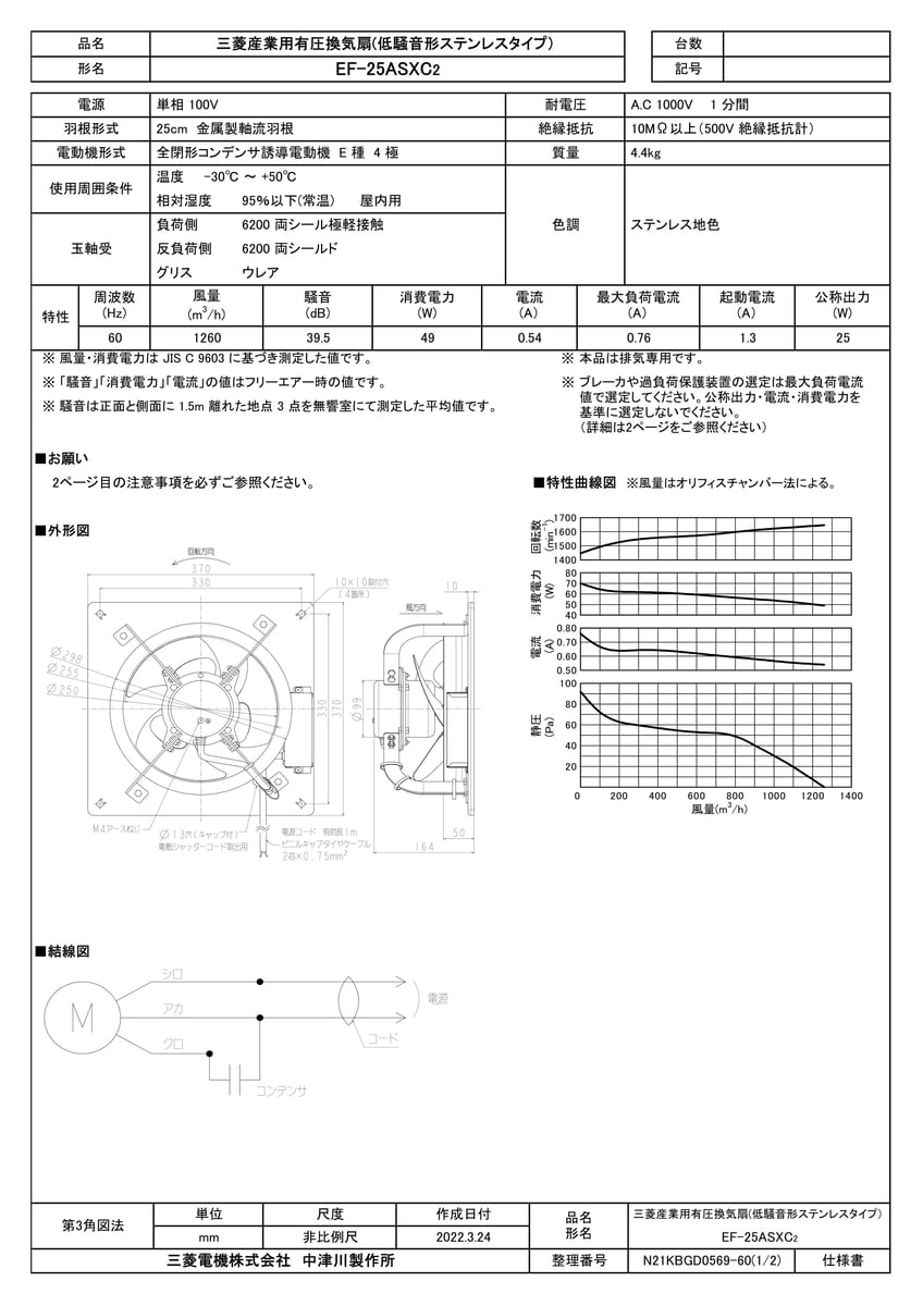有圧換気扇 低騒音ステンレスタイプ 単相 排気形