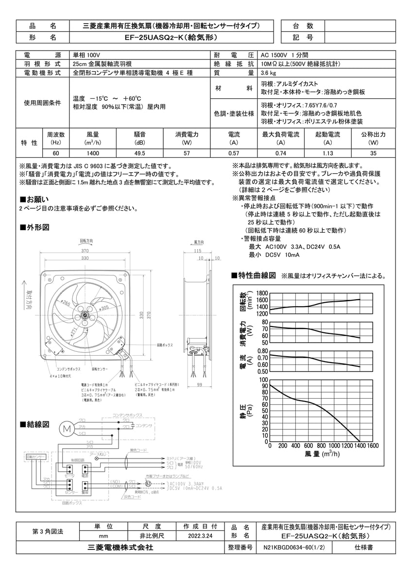 有圧換気扇 機器冷却用給気形 回転センサー付