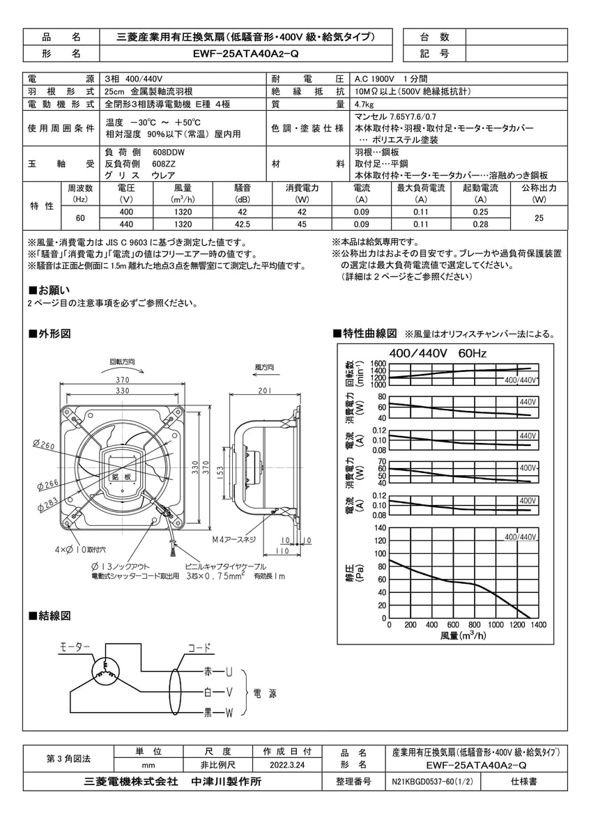 有圧換気扇 低騒音給気専用 三相