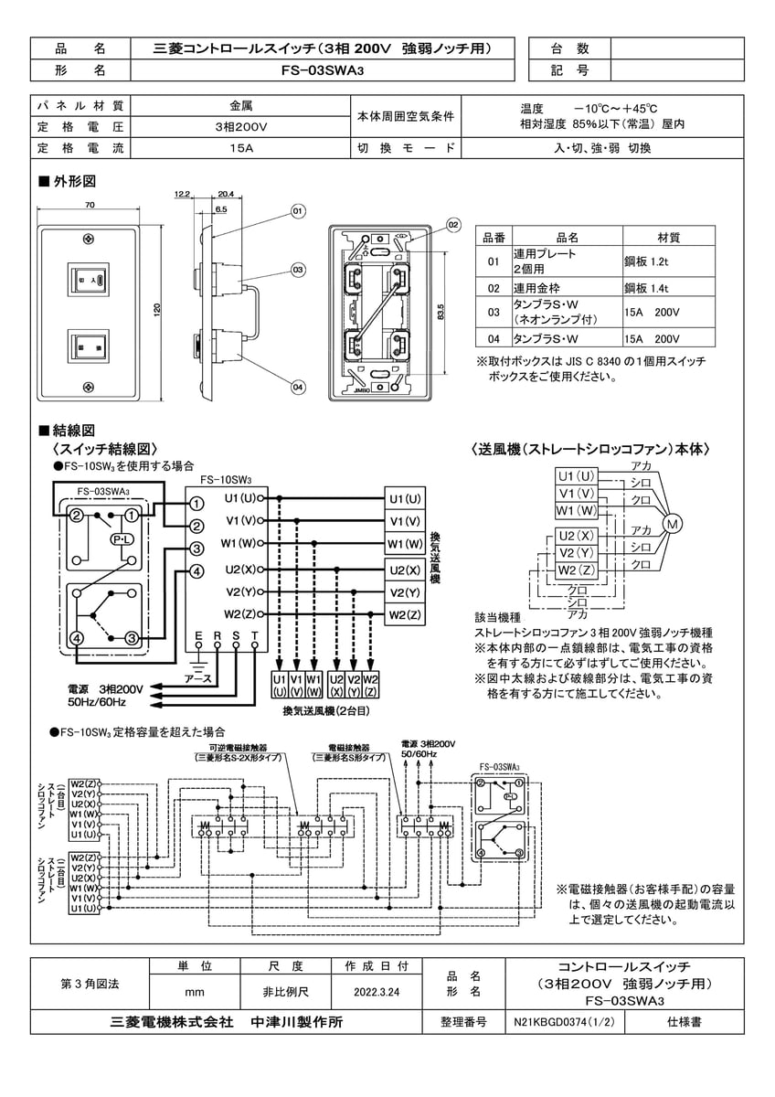 産業用送風機用コントロールスイッチ 3相200V強弱ノッチ用