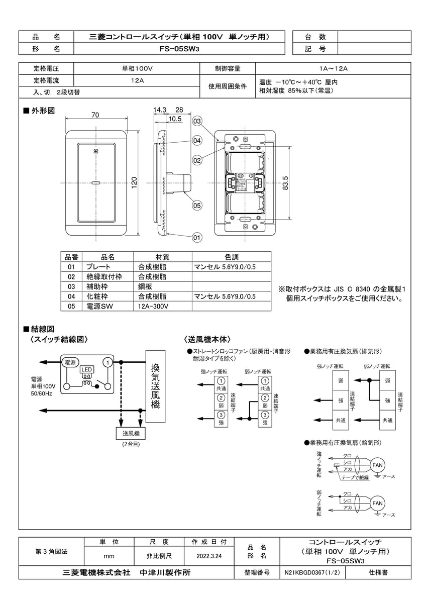 産業用送風機用コントロールスイッチ 単ノッチ用