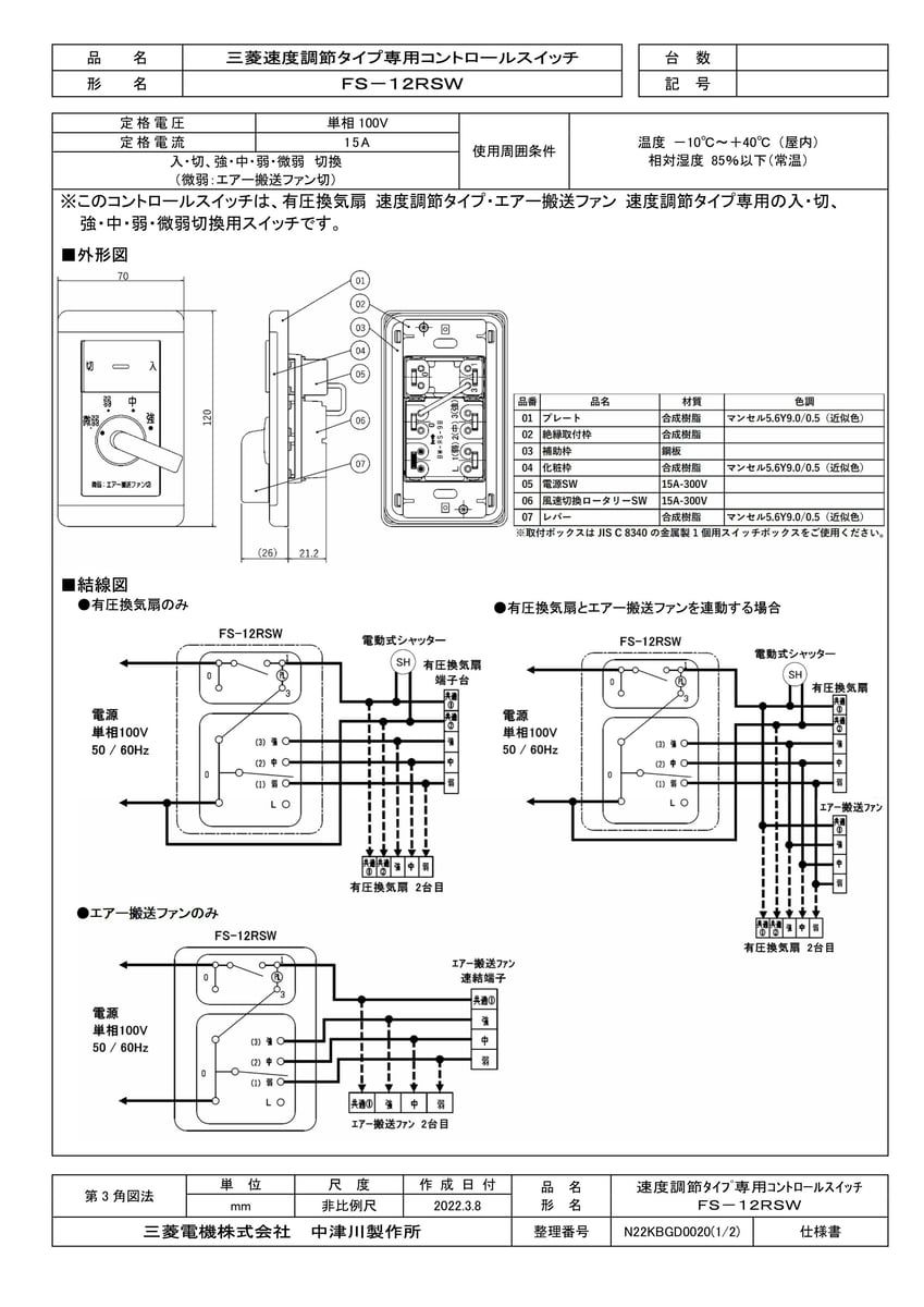 産業用送風機 その他部材 エアー搬送ファン用速度調節スイッチ