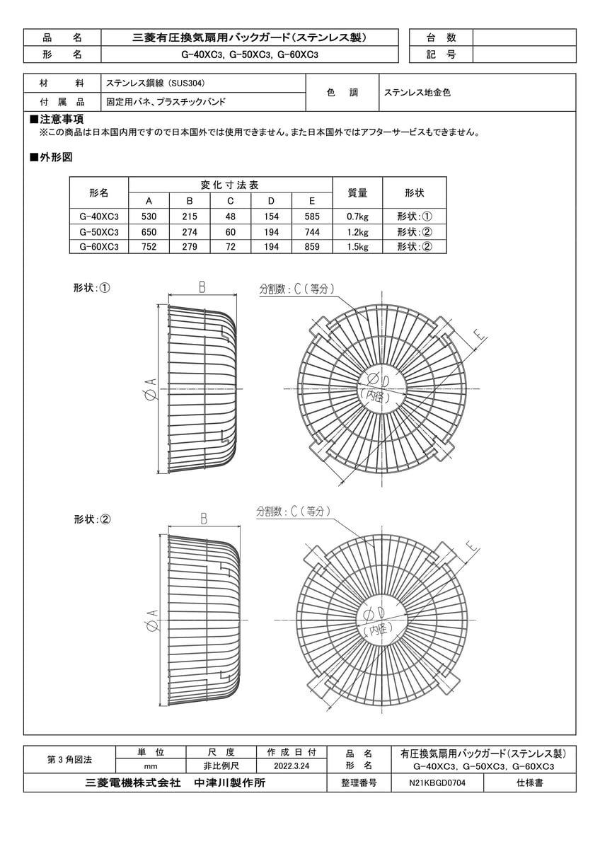 産業用送風機 有圧換気扇用部材 バックガード ステンレス製