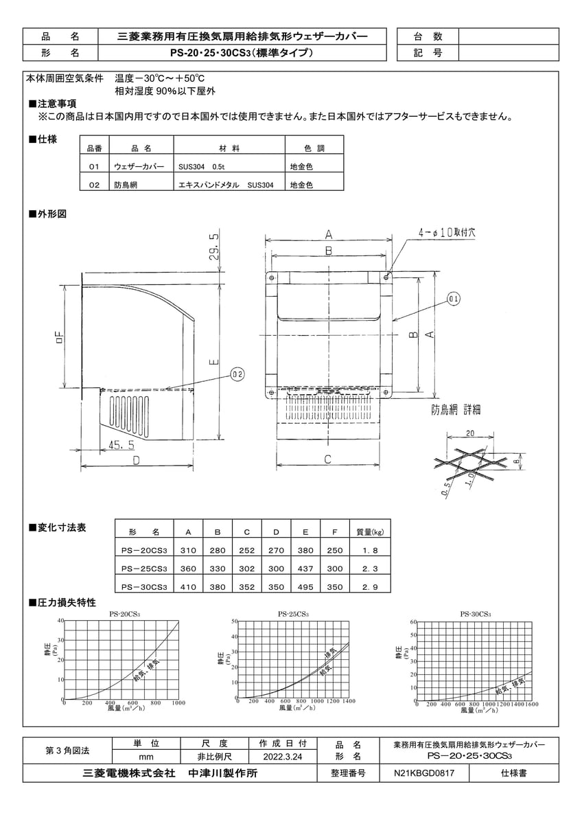 産業用送風機 有圧換気扇用部材 ステンレス製ウェザーカバー 防鳥網付