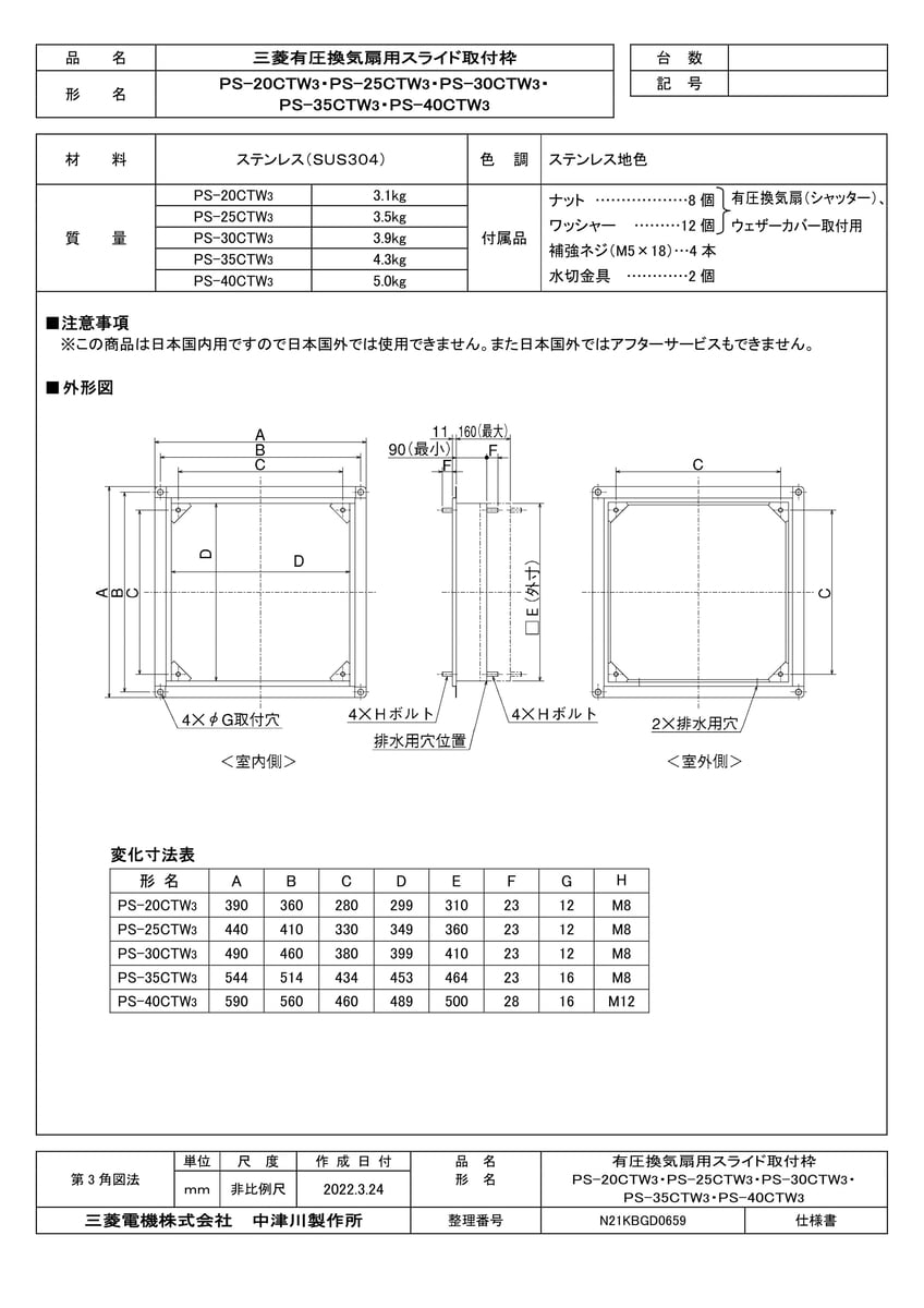 産業用送風機 有圧換気扇用部材 ステンレス製スライド取付枠