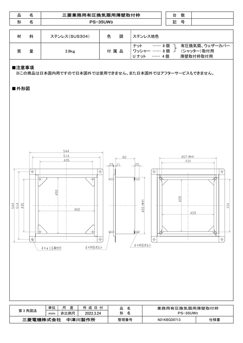 産業用送風機 有圧換気扇用部材 薄壁取付枠