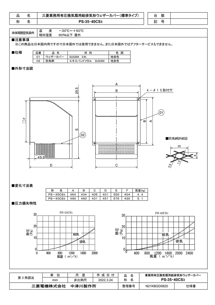 産業用送風機 有圧換気扇用部材 ステンレス製ウェザーカバー 防鳥網付