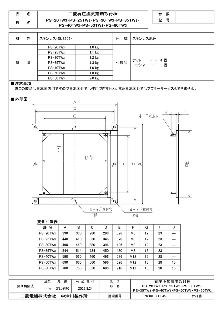 産業用送風機 有圧換気扇用部材 ステンレス製取付枠