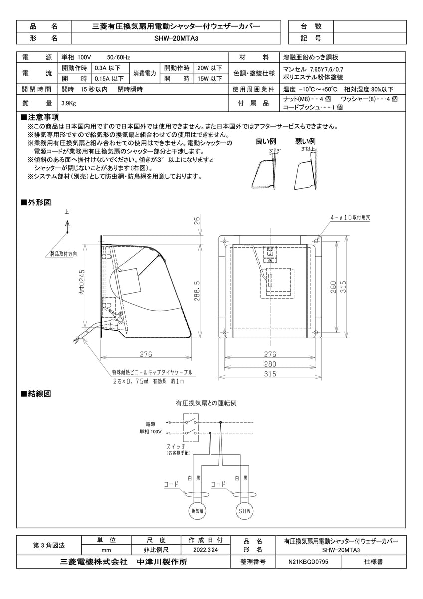 産業用送風機 有圧換気扇用部材 鋼板製ウェザーカバー 電動シャッター付
