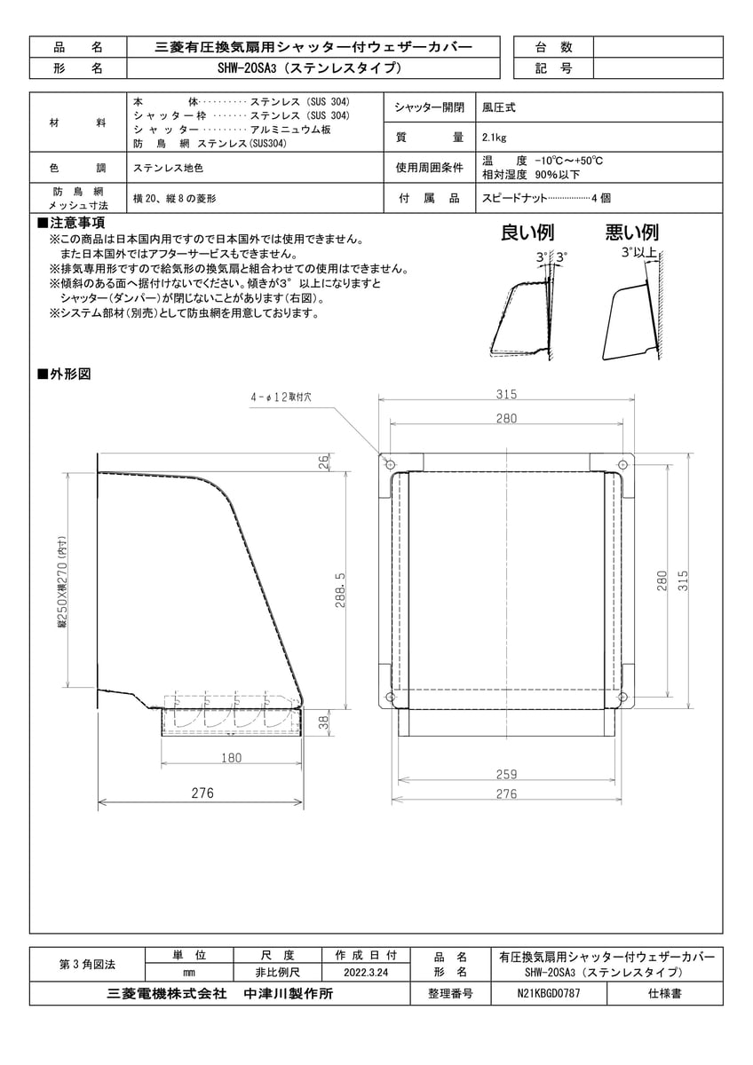 産業用送風機 有圧換気扇用部材 ステンレス製ウェザーカバー 風圧シャッター付