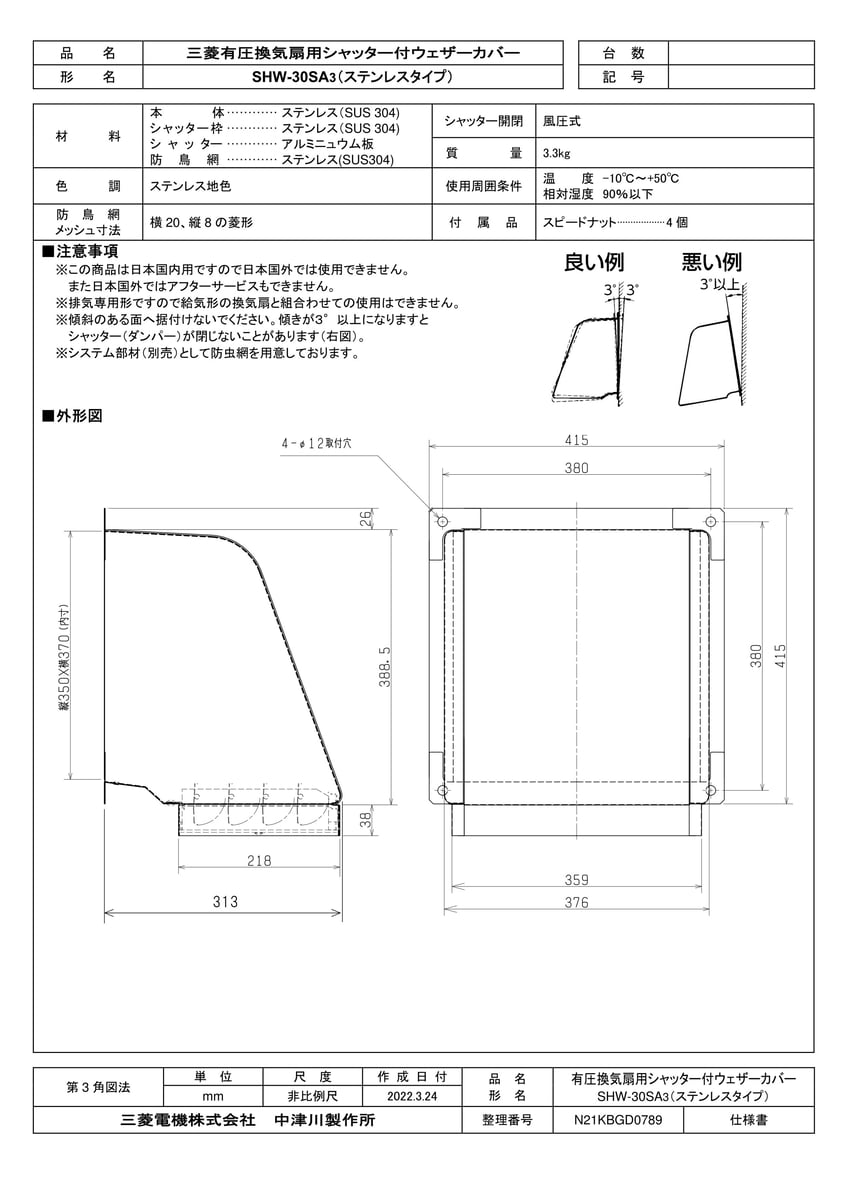 産業用送風機 有圧換気扇用部材 ステンレス製ウェザーカバー 風圧シャッター付