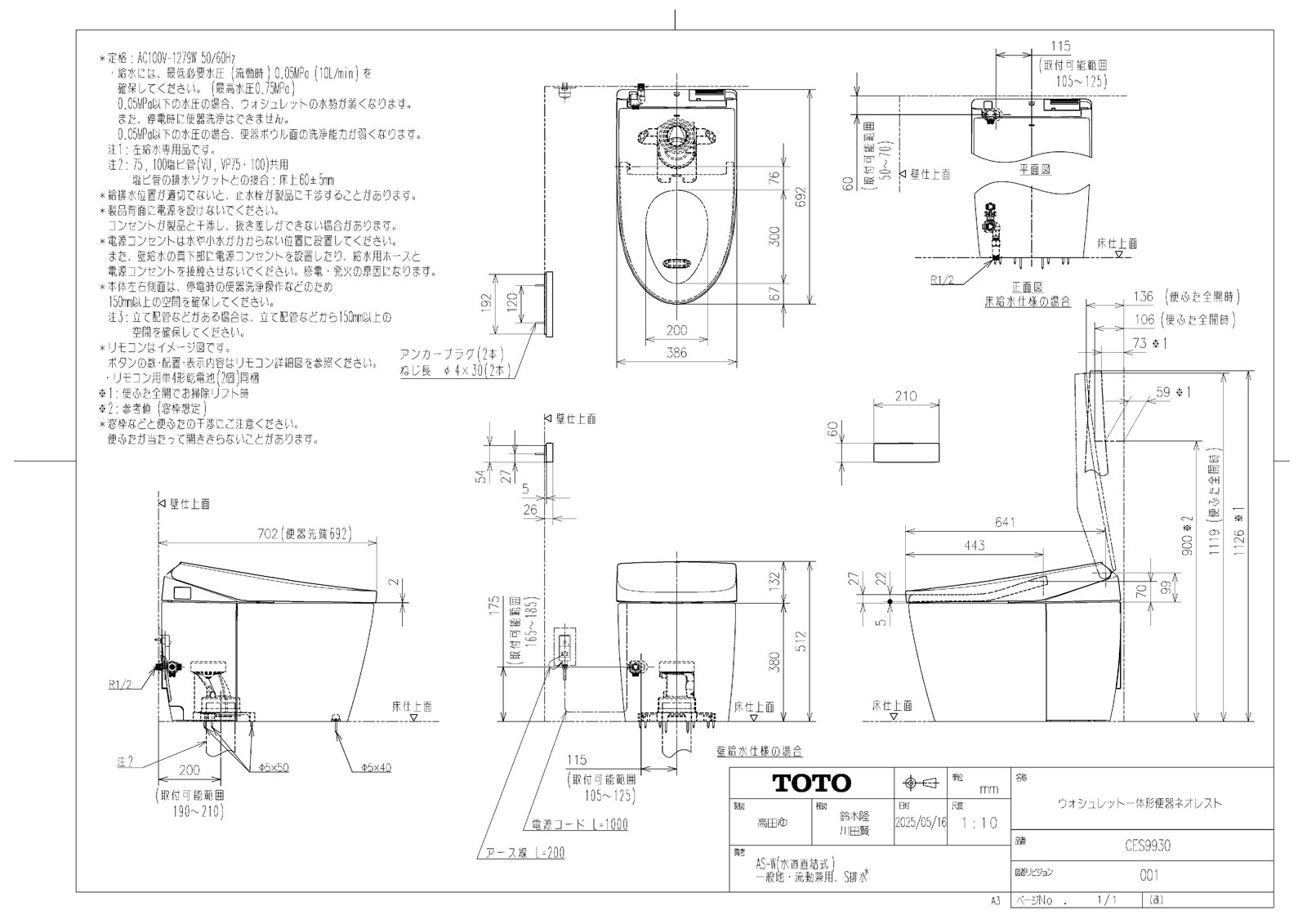 ネオレスト AS-W 一般地 壁床共通給水 床排水 排水芯200mm 標準リモコン
